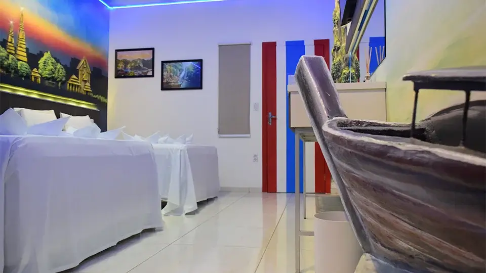 Pousada com parque aquático em Boa Vista, Roraima. Bem-vindo ao encantador apartamento temático tailandês da Pousada Country K, perfeito para uma estadia romântica ou uma escapada relaxante. Decorado com elementos tradicionais do Egito, nosso apartamento oferece uma experiência autêntica e confortável para até 6 pessoas (ou 7 com um colchão extra).